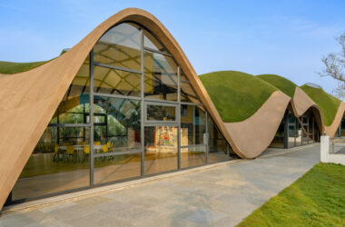 Step inside the Cocoon. Children learn under skylights and play on a rooftop hill, merging architecture with imagination