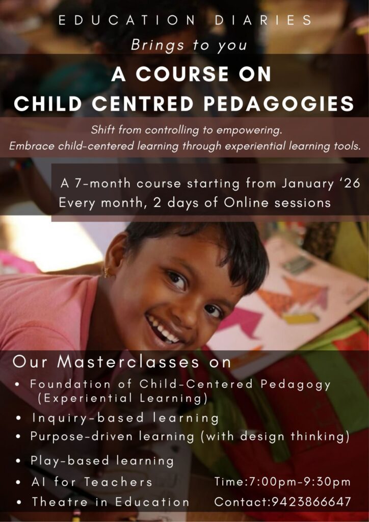 This 6–7 month Child-Centred Pedagogy Course brings together educators, school leaders, designers, and facilitators to explore how diverse progressive pedagogies emerge from the core philosophy of experiential learning. The course aims to build reflective, intentional educators who centre children’s curiosity, voice, and lived experiences in the learning process.