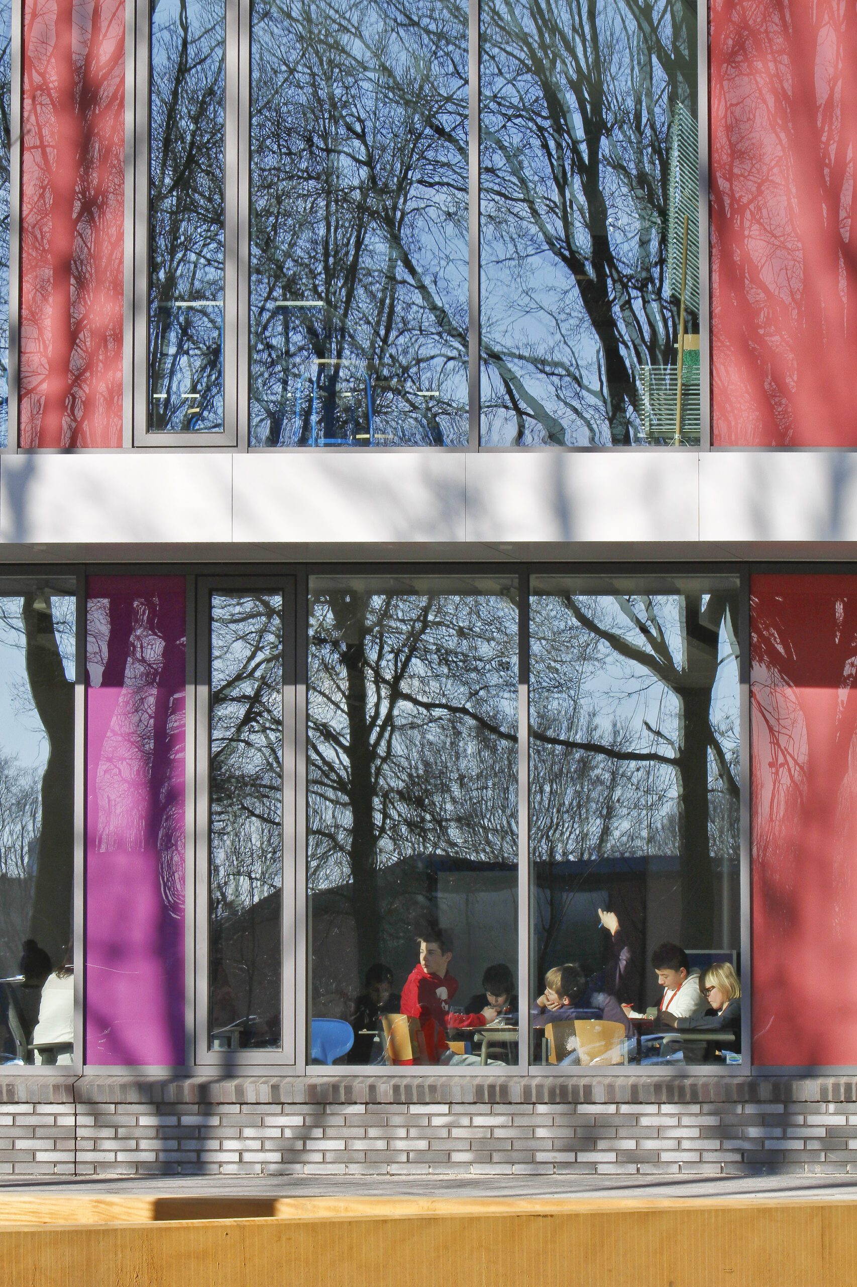 The transparent façade allows learning activities inside to be visible from the outside, reinforcing a sense of openness. This transparency is complemented by colored facade panels, creating a dynamic and inviting exterior. The linear, meandering design of the school ensures that each functional area has its own dedicated wing, while the centrally located learning domains remain easily accessible. A shared atrium serves as the heart of the building, seamlessly connecting the two wings and fostering interaction among students and staff.