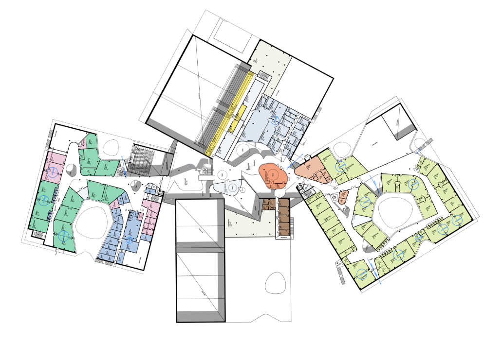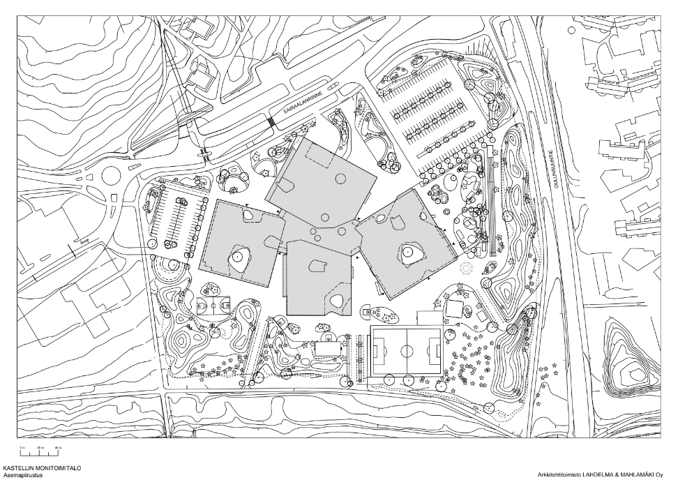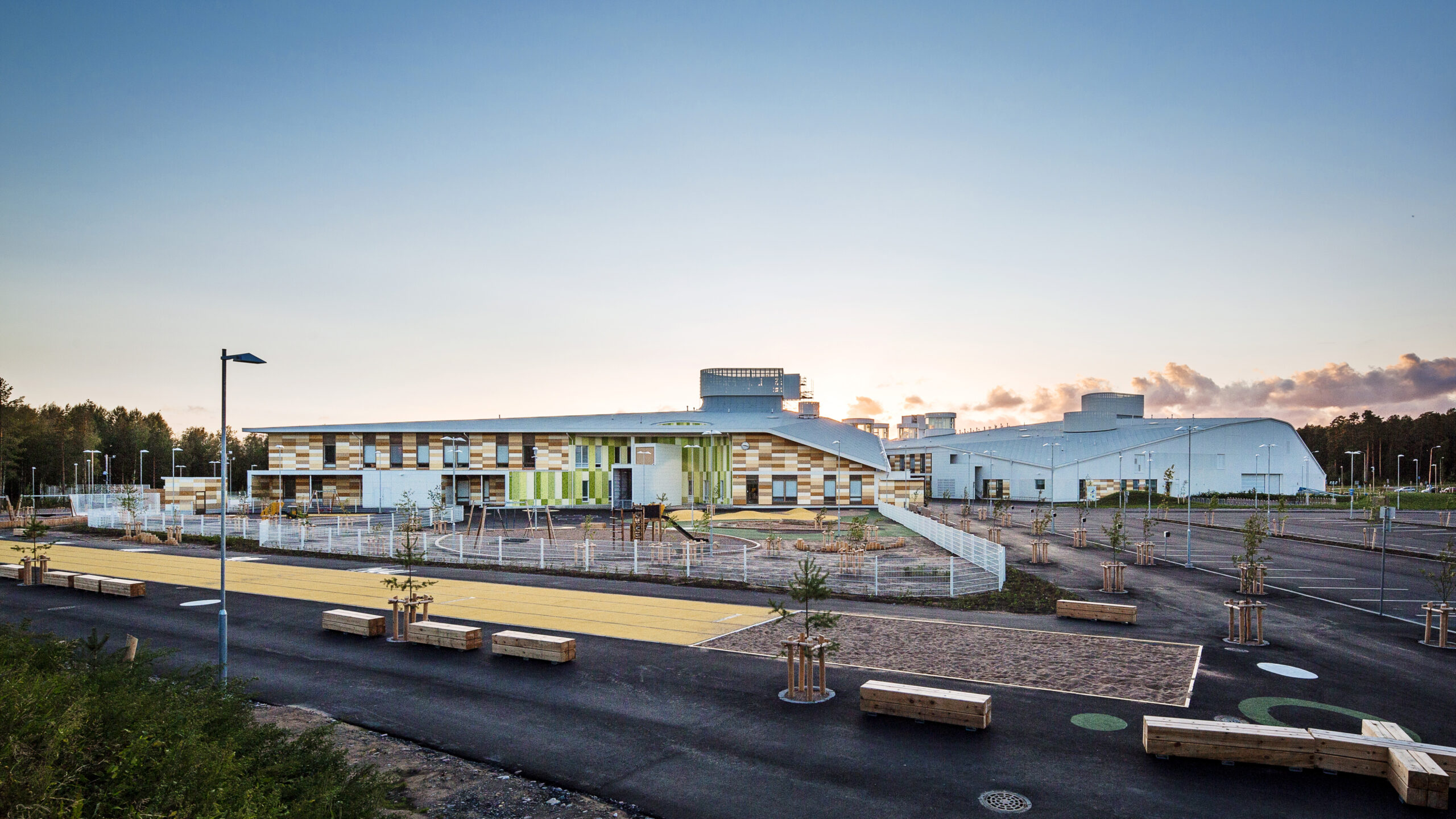 Due to its complexity the project was scheduled as a two-phase design competition. Despite this, Lahdelma & Mahlamäki Architects succeeded in creating a design which integrated what could have been a massive public building, comfortably into the modest sized village. The scale of such a project was also brought back to that of the primary users, children. Playful use of colours and shapes played an important role in the aesthetics of the design.