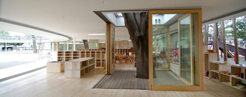 A controlled acoustic permeability of space is key, as it fosters connection with both the environment and the social life of the school. Material choices, spatial proportions, and architectural form — including its openings — all influence how sound is perceived: whether it lingers, echoes, flows or fades. Projects such as Fuji Kindergarten in Tokyo by Tezuka Architects and The Green School in Bali by IBUKU/PT Bambu embody these acoustic and ecological intentions in inspiring ways. Fuji’s elliptical design dissolves barriers between interior and exterior, allowing children to roam freely and absorb light and sound from the open air and surrounding trees. At The Green School, light filters through bamboo structures and learning unfolds in direct dialogue with the natural landscape. Both examples challenge the rigid boundaries of conventional classrooms, offering instead porous, multisensory spaces that support freedom, rhythm, and ecological attunement. As Gaston Bachelard writes in The Poetics of Space, space is like a nest: not simply a place of retreat but a primordial spatial archetype shaped from within, from the body itself and its needs. In this sense, learning spaces can be designed to absorb noise, soften reverberation and enhance sonic subtleties: an architecture that absorbs harshness, celebrates nuance, and restores sonic proximity – and therefore emotional proximity – to the world.