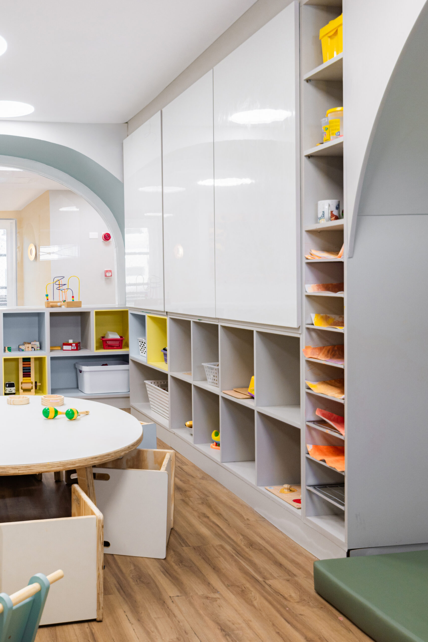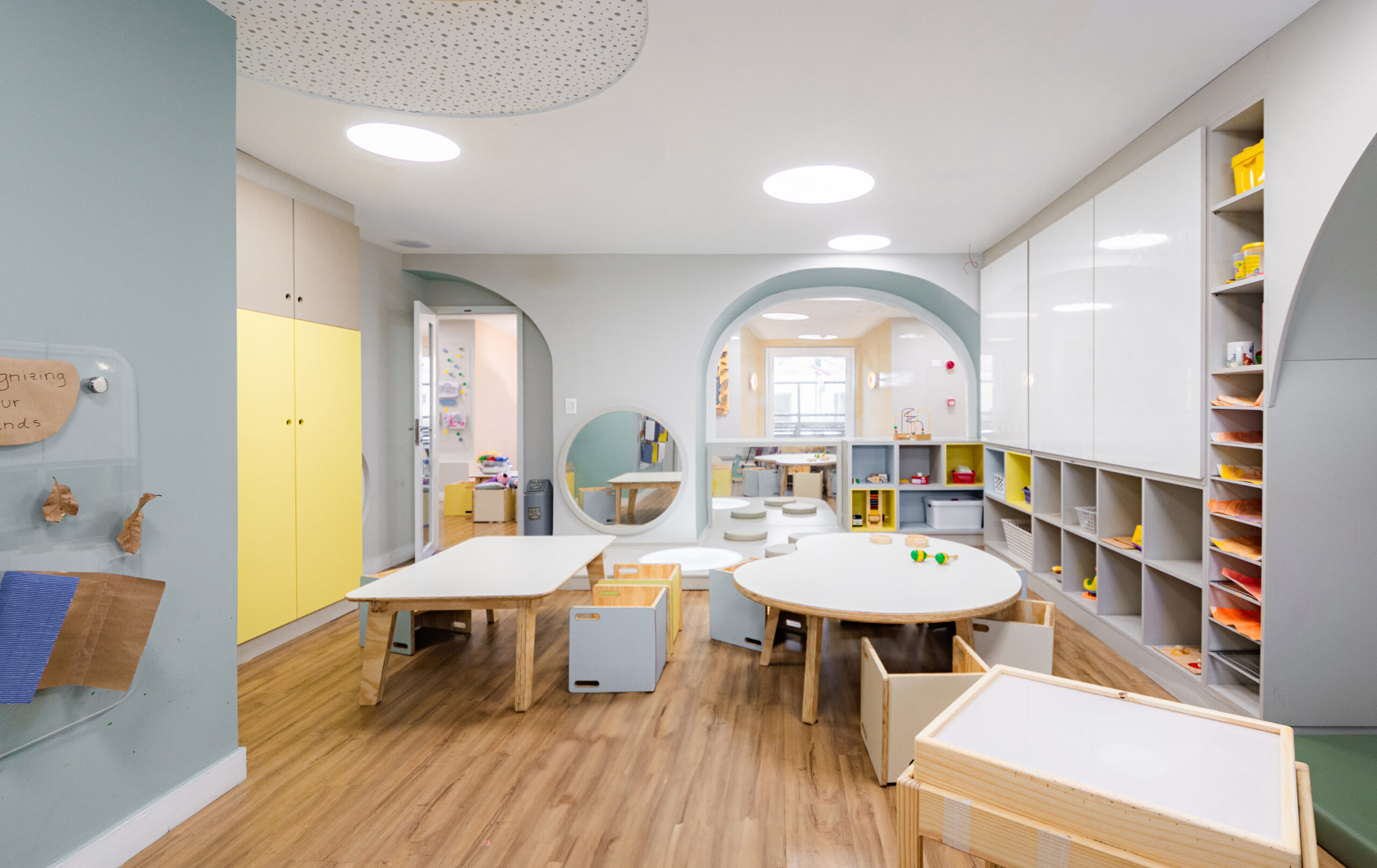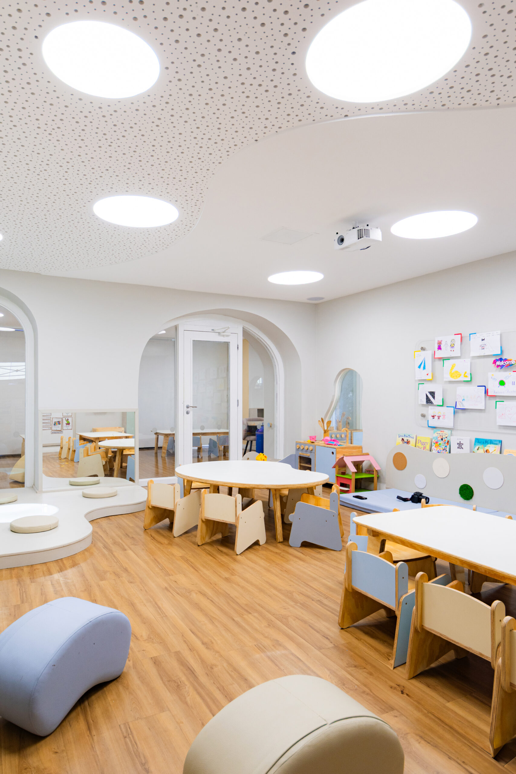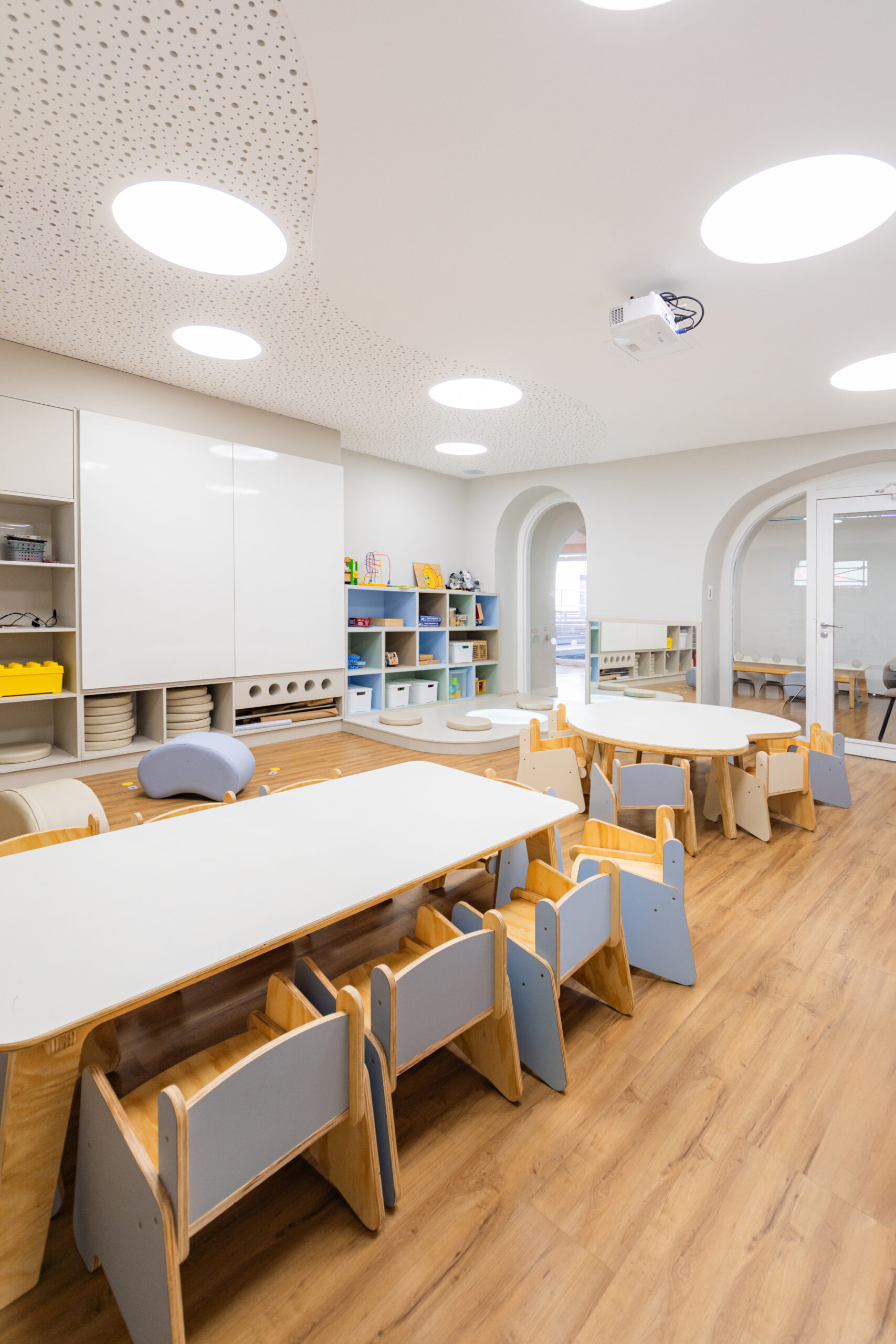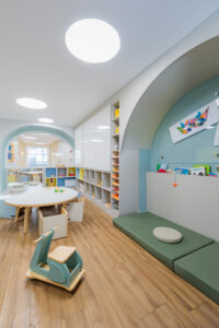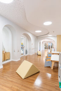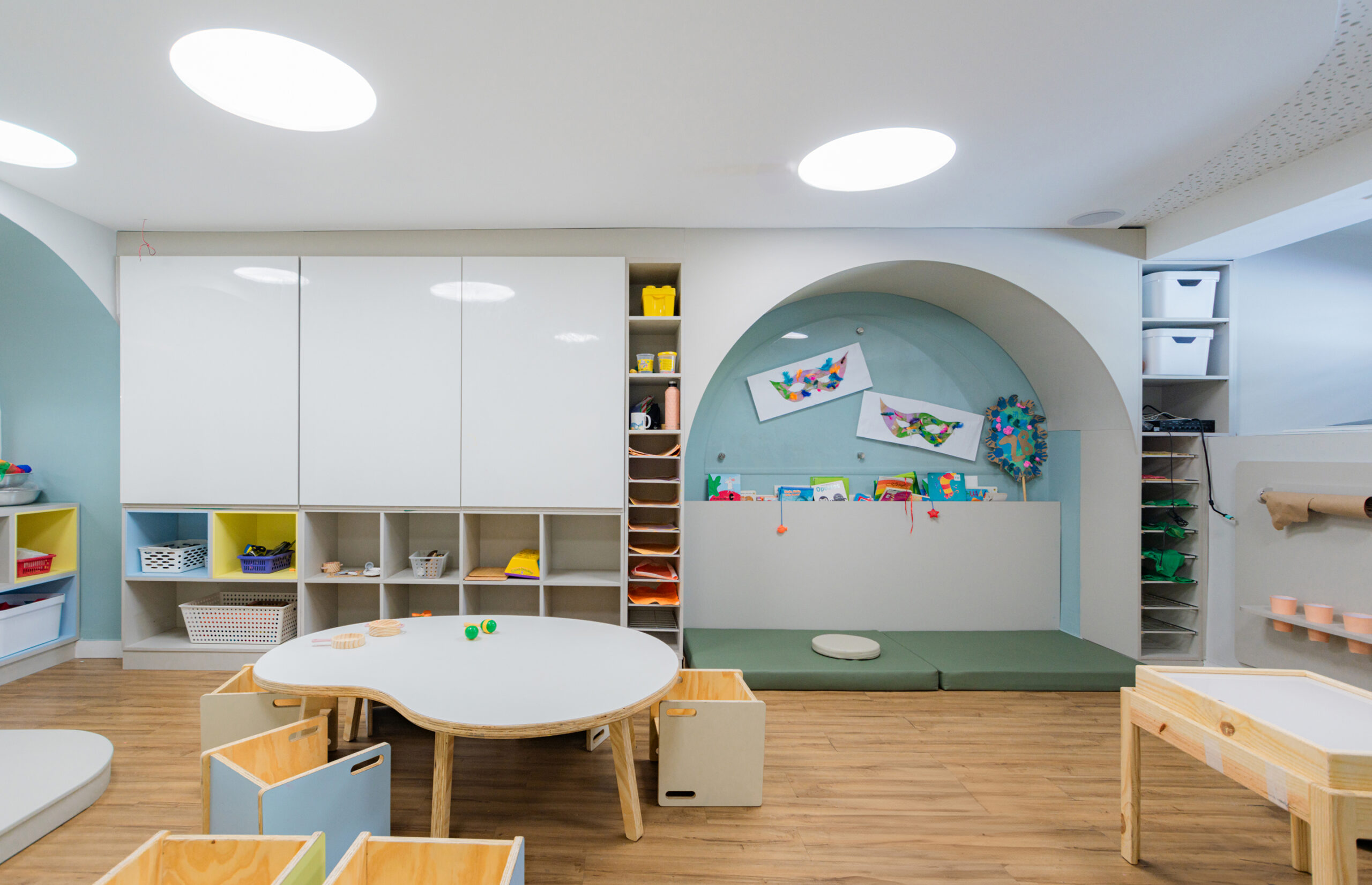 A calm and neutral color palette was chosen to foreground the children and their creations. Organic forms, tactile materials, and custom furniture scaled for young users foster free movement, curiosity, and independent engagement with the space.